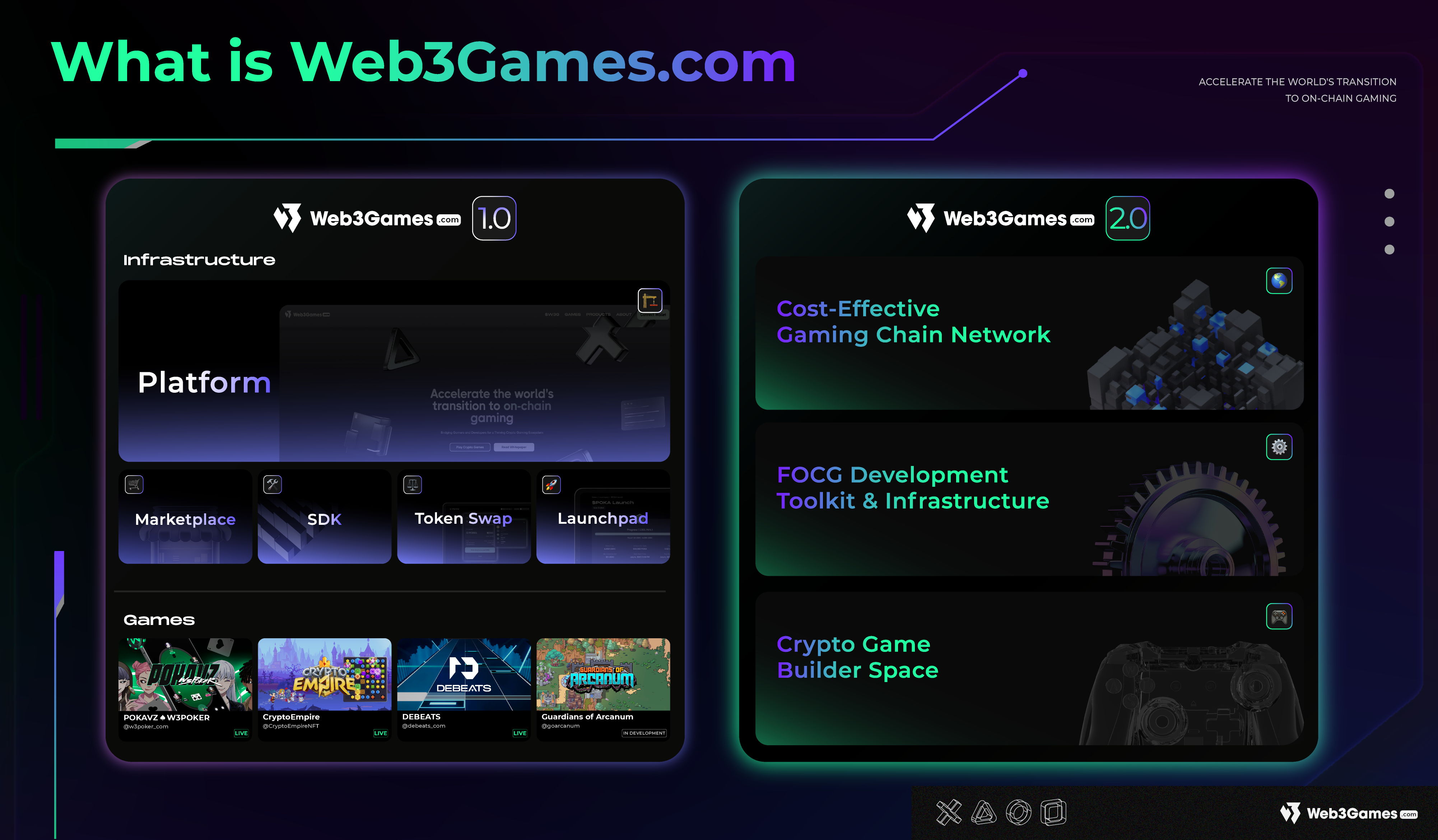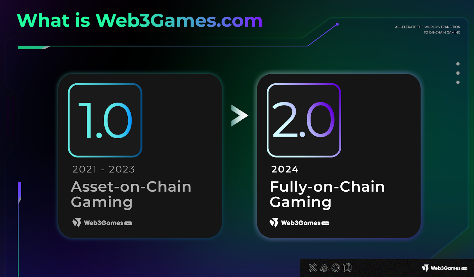 <figure><img src="https://421958314-files.gitbook.io/~/files/v0/b/gitbook-x-prod.appspot.com/o/spaces%2FgLRgvBAObB7v01IFgPg6%2Fuploads%2FkeQX8Xz9yj5ZV9lwcDlC%2Fnew%20style%20research%20page-19.png?alt=media&#x26;token=141d38cc-05d6-4a7d-86c4-846a77a75514" alt=""><figcaption><p>Web3Games.com is evolving from asset-on-chain games (1.0) to a fully-on-chain gaming experience (2.0).</p></figcaption></figure>