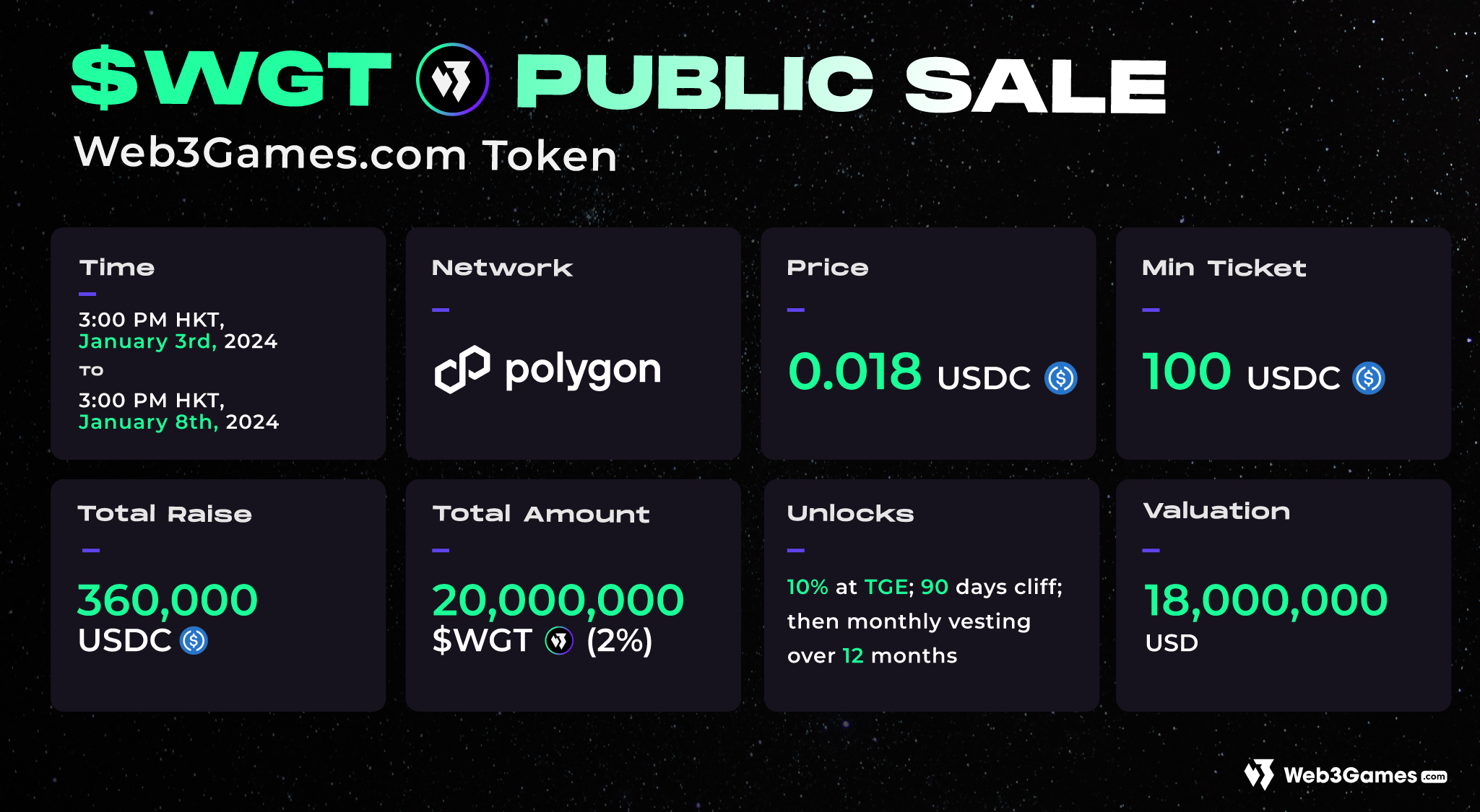 The public sale of $WGT will be scheduled to start from 3:00 PM HKT, January 3rd, 2024 to 3:00 PM HKT, January 8th, 2024; where the supply for public sale will take up 2% (20,000,000 $WGT) of the total supply (1,000,000,000 $WGT) and the token price will be set at a fixed price of $0.018 per token with the targeted fundraising of 360,000 USDC. 10% (2,000,000 $WGT) of the supply distributed in the public sale will be immediately unlocked upon TGE, and the rest will follow the monthly vesting routine over 12 months after a cliff of 3 months lockup.