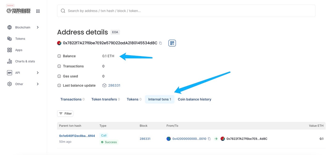 3. You can verify the success of your transaction by checking the Internal txns. Your ETH balance will be displayed on the page, too.