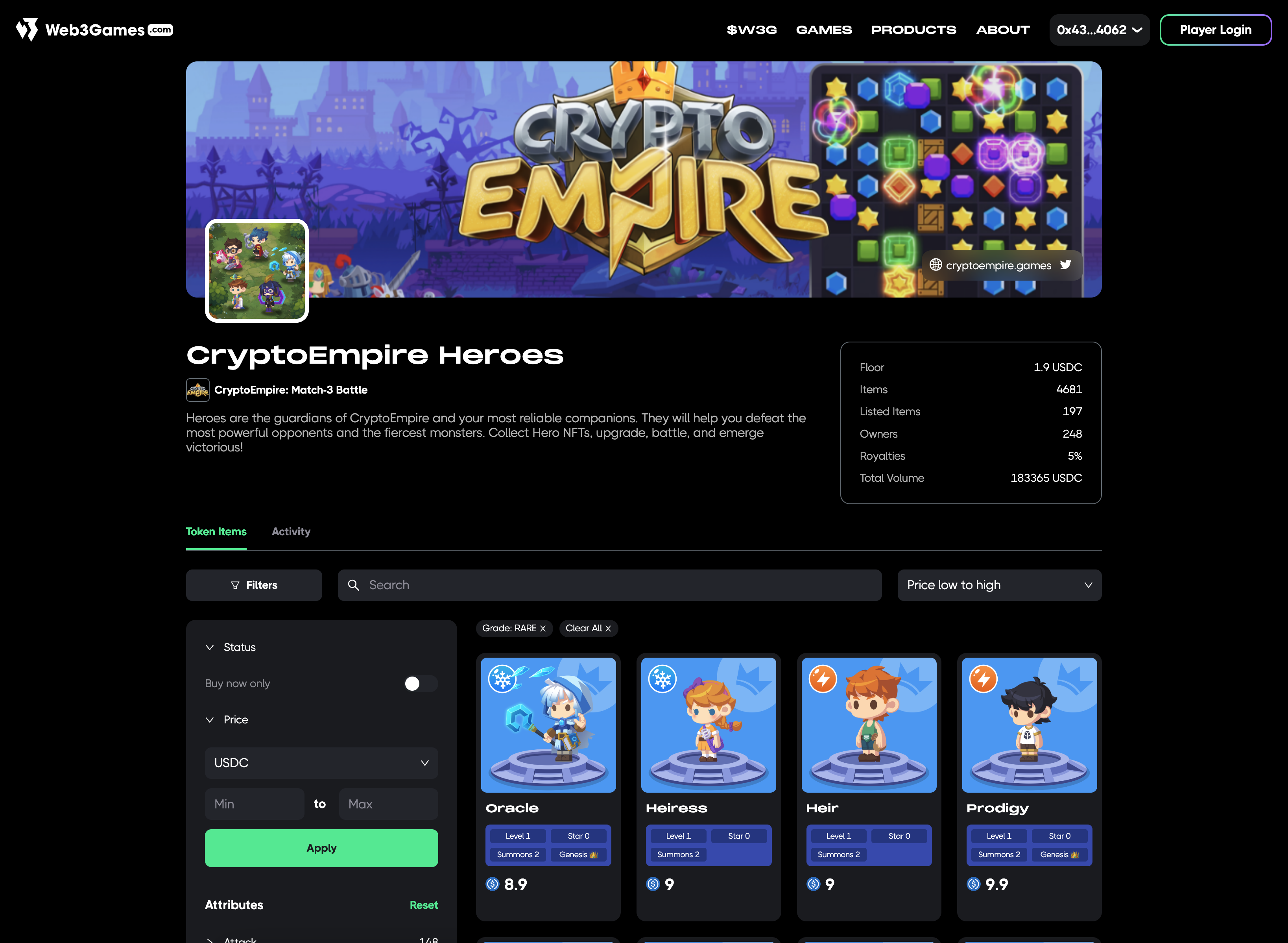 <figure><img src="https://421958314-files.gitbook.io/~/files/v0/b/gitbook-x-prod.appspot.com/o/spaces%2FgLRgvBAObB7v01IFgPg6%2Fuploads%2FqP4WJZjZFBJrySFb6CEQ%2Fimage.png?alt=media&#x26;token=d5079e58-7c4a-4f43-86cd-f011d88f6a03" alt=""><figcaption><p>Colleciton Page: CryptoEmpire Heroes</p></figcaption></figure>